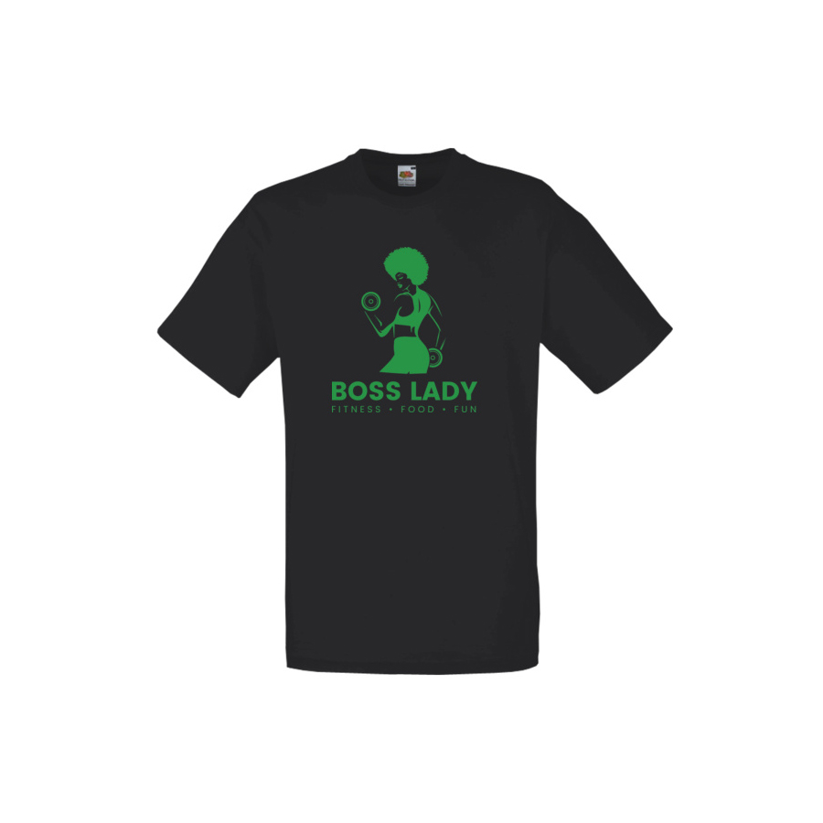 Classic black T-shirt with green”Boss Lady” design across the front.